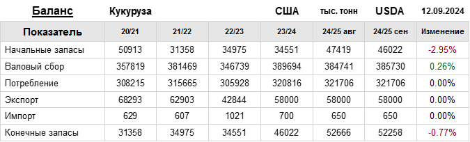 За прошедший месяц министерство сельского хозяйства США (USDA) на 12.09.2024 пересмотрело Баланс кукурузы для США в сезоне 24/25 следующим образом: