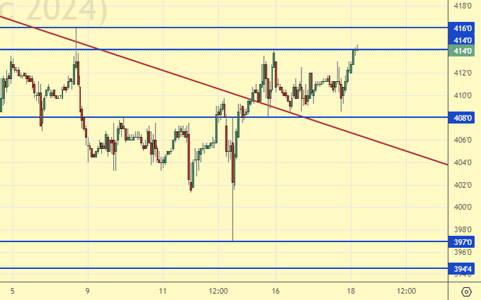 Куда-то мы не туда пошли… Нам надо вниз, а быки пихают «эту штуку» вверх. Тем не менее, пока надеемся на откат, только уже не к 400.0, а к 404.0. Там купим. Надеемся, что это не ошибка.