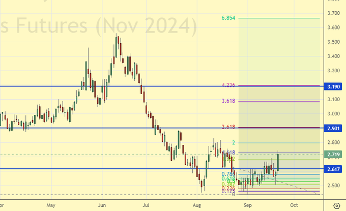Сценарий роста: перешли на ноябрьский фьючерс, дата экспирации 29 октября. Продолжаем держать лонги. Цель на 3.190 в преддверии зимы представляется интересной.