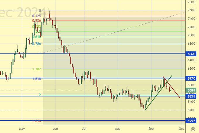 Спустя 10 дней после выхода сентябрьского отчета WASDE можно говорить о том, что рынок осознал собственную сбалансированность. Не будет ничего удивительного в том, что наметившаяся коррекция по пшенице и кукурузе продолжится всю следующую неделю. Риск падения к 500.0 по пшенице выше, чем риск падения кукурузы к 360.0. Эти уровни совсем не обязательны для достижения, но мы можем получить данный сюрприз, прежде чем начнется уже двухмесячный осенний рост. Падение цен может быть связано с тем, что зерно из черноморского региона уходит по «любой цене», из-за напряжения, связанного с СВО. Кроме того, традиционные крупные поставщики зерновых такие как Бразилия и Аргентина заинтересованы в валюте как всегда крайне сильно. Особенно это касается Аргентины с её трехзначной инфляцией. Значит, будут продавать по бросовым ценам.