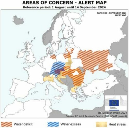 Даже в Польше, северо-восточной Германии и Литве наблюдались засушливые условия, что снизило потенциал урожайности кукурузы. В сентябре влажная (и прохладная) погода пришла на значительные территории Европы, особенно в центральную Европу (южная и восточная Германия, Чехия, Австрия, западная Словакия и западная Словения), где она приняла форму продолжительных сильных штормов и продолжительных наводнений, оказавших негативное влияние на урожай, которое на данный момент трудно оценить количественно.
