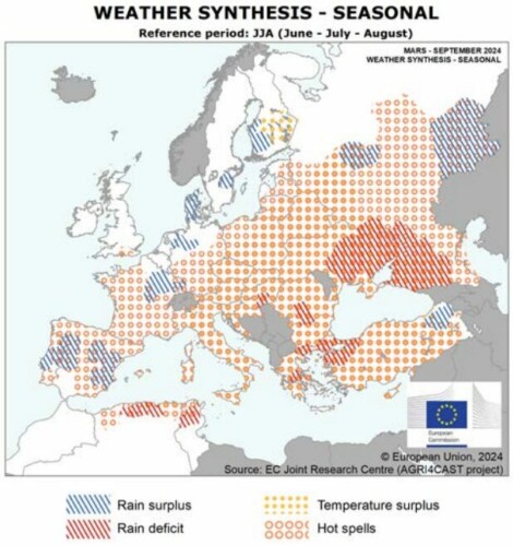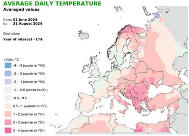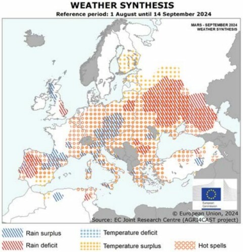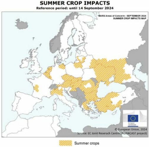 Очень высокие температуры были зафиксированы на большей части южной (Италия, Греция), южной центральной (Словения, восточная Хорватия, Австрия, Чехия, Словакия, восточная Польша, Венгрия) и восточной Европы (Румыния, Болгария), создав значительные проблемы для летних культур. С 1 августа произошло несколько тепловых волн, максимальные температуры часто превышали 35 °C. Жаркая погода оказала негативное влияние на накопление биомассы и сократила период налива зерна у яровых культур во всех вышеупомянутых странах. В первую очередь в Румынии, Болгарии, Венгрии, Словакии и Австрии жаркая погода сочеталась с постоянным дефицитом осадков, что сильно снижало влажность почвы и способствовало раннему увяданию летних культур.