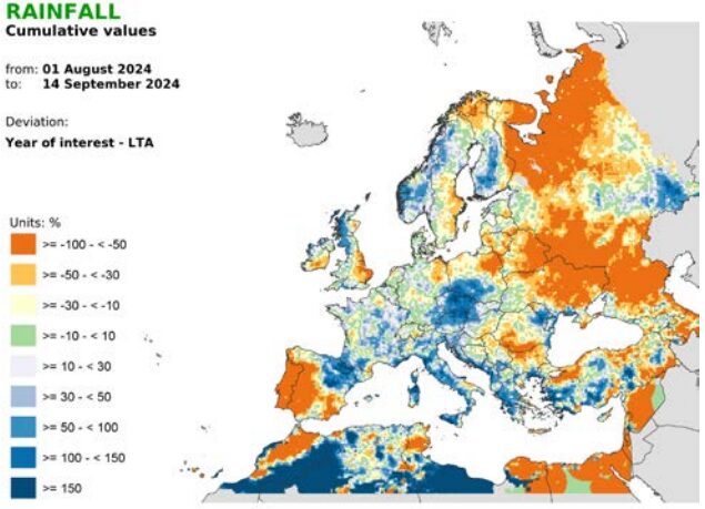 В юго-восточной Германии, Австрии и юго-западной Чехии накопление биомассы идет в соответствии с МТА, так как летние культуры начали страдать от дефицита осадков в середине августа. В восточной Германии и западной Польше общий прогноз для летних посевов остается положительным, но дефицит осадков в августе снизил уровень влажности почвы и вызвал преждевременное созревание летних посевов. В восточной Польше и странах Балтии яровые зерновые культуры достигли конца своего цикла в августе, темпы роста опережали средние показатели, что свидетельствует о продвижении сезона.