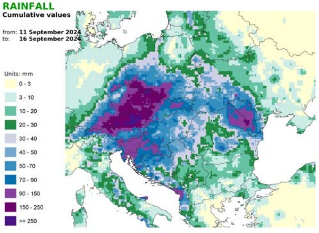 Предупреждение о сильном дожде (оранжевое предупреждение) было выпущено Службой управления чрезвычайными ситуациями JRC Copernicus (CEMS EFAS) еще 9 сентября. Сильные дожди наблюдались в этих регионах с момента начала явления 13 сентября. На нескольких станциях суточное количество осадков превысило 100 мм, максимальное суточное количество осадков составило 172 мм в Австрии и около 145 мм на северо-востоке Чехии; в обоих случаях за период с 11 по 16 сентября выпало около 350 мм осадков. Эти суммы осадков превысили среднее суммарное количество осадков за весь сентябрь, а в некоторых случаях даже за весь осенний сезон.