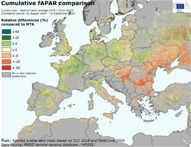 В Словакии, Венгрии и западной Румынии дефицит осадков, который наблюдался в регионе с начала июля, значительно повлиял на накопление биомассы. В западной части Турции, Болгарии, южной и восточной Румынии и южной Украине засуха еще более сильна, и в течение всего лета сохраняется сильная отрицательная аномалия fAPAR.