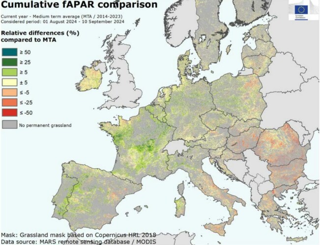 В Западной и Северной Европе сохранялись благоприятные условия для накопления биомассы пастбищ и развития кормовых культур. В центральной и восточной Европе с середины августа по сентябрь на пастбищах наблюдалась экстремальная жара, которая сопровождалась дефицитом осадков, что снизило потенциал урожайности на пастбищах, а затем значительное снижение температуры и обильные осадки привели к обширным наводнениям в центральной Европе.