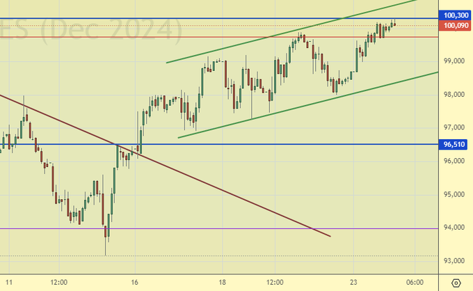 Стоим мы так прекрасно, что не продать отсюда просто нельзя. Входите в шорт. Кто уже в позиции просто сместите стоп чуть вверх и наслаждайтесь. Если рынок все-таки закрепится выше 100000, то мы пойдем к 105000.