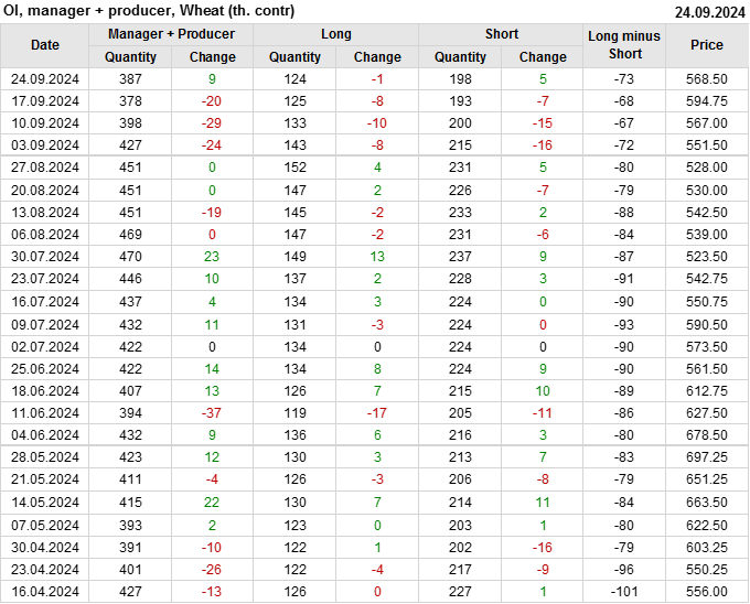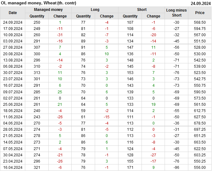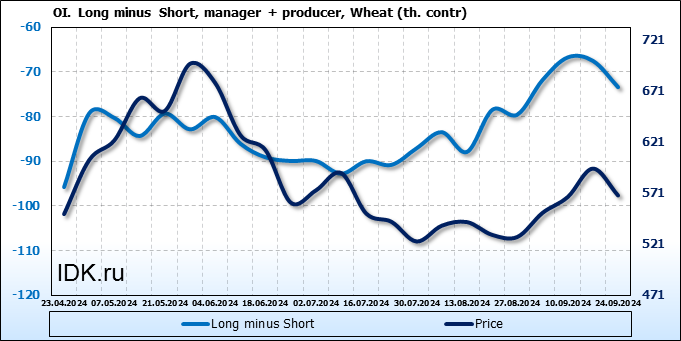 За прошедшую неделю, 18.09.24 — 24.09.24, разница между длинными и короткими позициями управляющих увеличилась на 3 тыс. контрактов. В тоже время, цена упала на 26.25 цента.