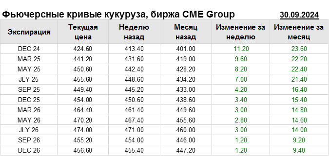 На 30.09.2024 стоимость кукурузы на бирже CME Group по контракту DEC 24 составила 424.6 цента за бушель. За прошедшую неделю стоимость кукурузы на площадке CME Group выросла на 11.2 цента/бушель. Как мы видим на графике, фьючерсная кривая имеет периоды, когда более дальний фьючерс дешевле ближнего. Состояние бэквардации наблюдаем на следующих контрактах: SEP 25; SEP 26. Таким образом, трейдеры предполагают, что возможно превалирование предложения над спросом в указанные периоды.