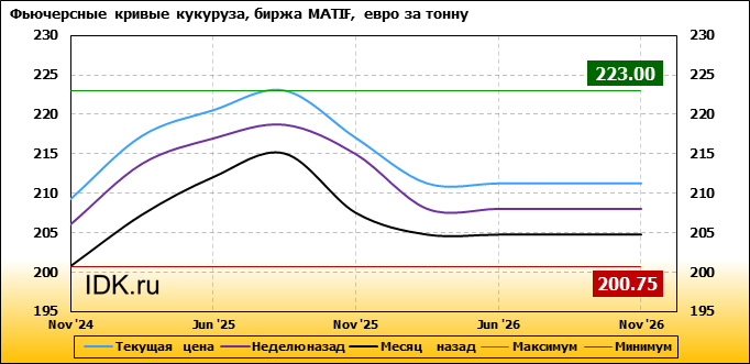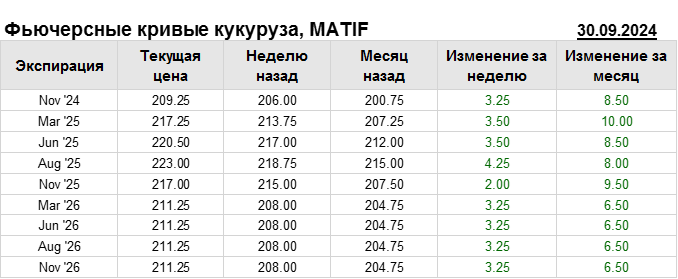 На 30.09.2024 стоимость кукурузы на бирже MATIF по контракту Nov ’24 составила 209.25 евро за тонну. За прошедшую неделю стоимость кукурузы на европейской площадке выросла на 3.25 евро/тонна. Как мы видим на графике, фьючерсная кривая имеет периоды, когда более дальний фьючерс дешевле ближнего. Состояние бэквардации наблюдаем на следующих контрактах: Nov ’25; Mar ’26. Таким образом, трейдеры предполагают, что возможно превалирование предложения над спросом в указанные периоды.
