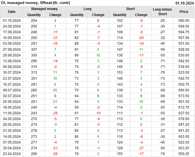 За прошедшую неделю, 25.09.24 — 01.10.24, разница между длинными и короткими позициями управляющих сократилась на 5.6 тыс. контрактов. В тоже время, цена выросла на 11.5 цента.