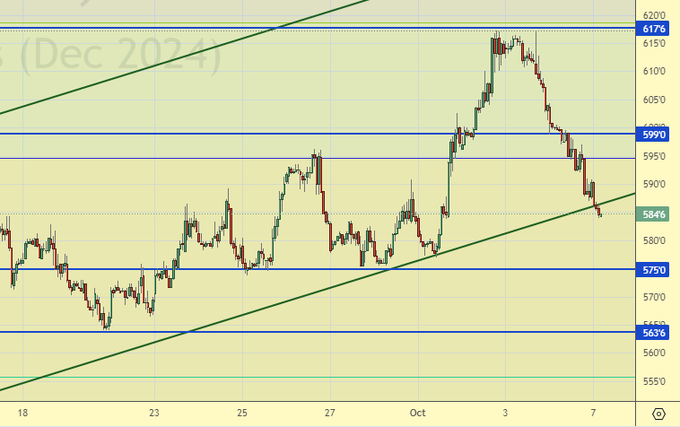 Не захотели нам давать сразу отметку 650.0, что отчасти связано с ростом конечных запасов по пшенице в США по итогам сентября: год к году +12%. Учитывая хорошие объемы текущего урожая 797 млн. тонн (очередной глобальный рекорд, между прочим) мы не можем говорить о высоких ценах на пшеницу, но восстановление к 650.0, хотя бы кратковременное, смотрелось бы вполне корректно в рамках осеннего процесса осознания объемов валового сбора и баланса спроса и предложения. А спрос будет. 100%.