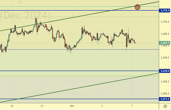 Чтобы там не творилось на Ближнем Востоке, а расти мы не можем. Внизу нас тянет к себе 2618. Если не будет удара в 2720, то продавцы смогут разломать текущий рост на горизонте два – три месяца и мы спустимся куда-то к 2120.