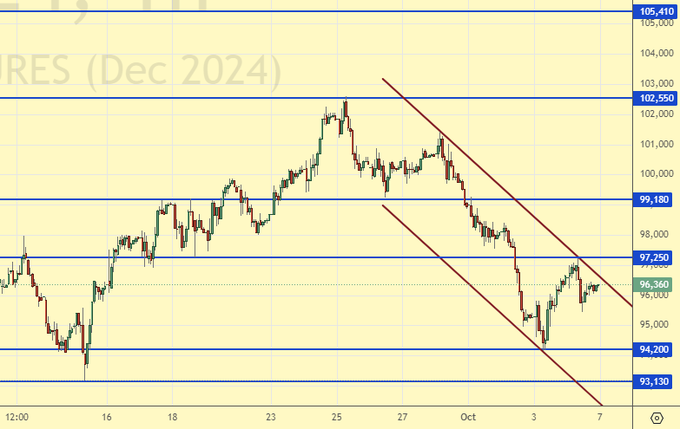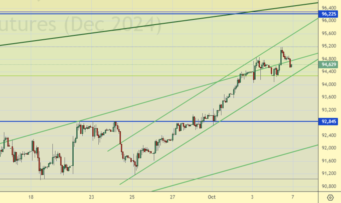 Имеет смысл постоять и не торопиться с фиксацией прибыли. Народ уже пишет: «даешь откат», но это всего лишь хотелки. Мы способны посетить 96200 прежде, чем увидим какое-то охлаждение.