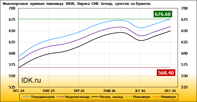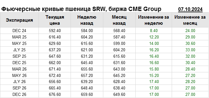 На 07.10.2024 стоимость пшеницы SRW на бирже CME Group по контракту DEC 24 составила 592.4 цента за бушель. За прошедшую неделю стоимость пшеницы SRW выросла на 8.4 цента/бушель. Как мы видим на графике, фьючерсная кривая имеет периоды, когда более дальний фьючерс дешевле ближнего. Состояние бэквардации наблюдаем на следующих контрактах: JLY 26. Таким образом, трейдеры предполагают, что возможно превалирование предложения над спросом в указанные периоды.