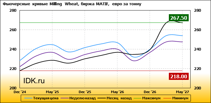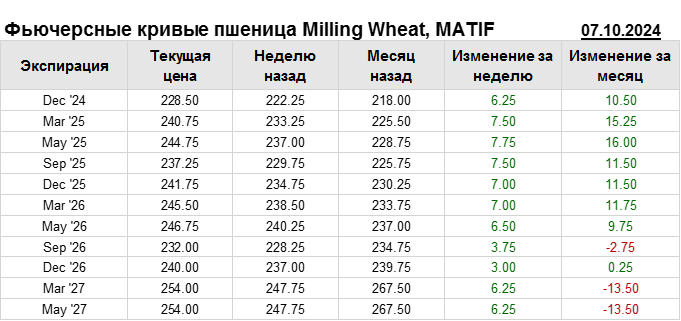 На 07.10.2024 стоимость пшеницы Milling Wheat на бирже MATIF по контракту Dec ’24 составила 228.5 евро за тонну. За прошедшую неделю стоимость пшеницы Milling Wheat выросла на 6.25 евро/тонна. Как мы видим на графике, фьючерсная кривая имеет периоды, когда более дальний фьючерс дешевле ближнего. Состояние бэквардации наблюдаем на следующих контрактах: Sep ’25; Sep ’26. Таким образом, трейдеры предполагают, что возможно превалирование предложения над спросом в указанные периоды.