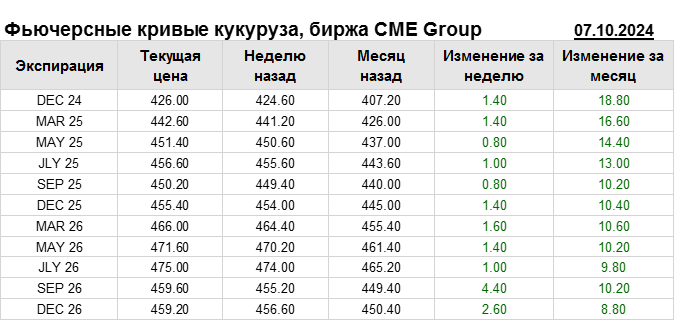 На 07.10.2024 стоимость кукурузы на бирже CME Group по контракту DEC 24 составила 426 центов за бушель. За прошедшую неделю стоимость кукурузы на площадке CME Group выросла на 1.4 цента/бушель. Как мы видим на графике, фьючерсная кривая имеет периоды, когда более дальний фьючерс дешевле ближнего. Состояние бэквардации наблюдаем на следующих контрактах: SEP 25; SEP 26; DEC 26. Таким образом, трейдеры предполагают, что возможно превалирование предложения над спросом в указанные периоды.