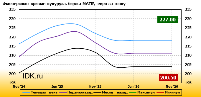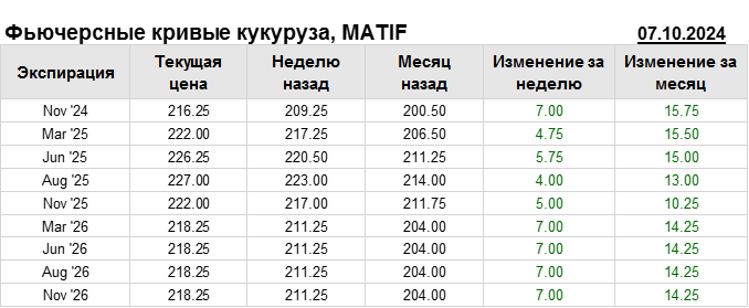 На 07.10.2024 стоимость кукурузы на бирже MATIF по контракту Nov ’24 составила 216.25 евро за тонну. За прошедшую неделю стоимость кукурузы на европейской площадке выросла на 7 евро/тонна. Как мы видим на графике, фьючерсная кривая имеет периоды, когда более дальний фьючерс дешевле ближнего. Состояние бэквардации наблюдаем на следующих контрактах: Nov ’25; Mar ’26. Таким образом, трейдеры предполагают, что возможно превалирование предложения над спросом в указанные периоды.