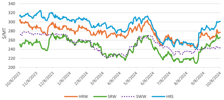 Внутренние цены: котировки на все классы в США выросли после сентябрьского прогноза WASDE, отреагировав на рост мировых экспортных котировок. Цена на твердую красную озимую выросла на $7 за тонну до $277 в соответствии с ростом котировок в Черном море. Котировки твердой красной яровой выросли на $19 за тонну до $301, что совпало с ростом котировок в Канаде. Мягкая красная озимая подорожала на $24/тонна до $266 благодаря большим продажам и поставкам в Западное полушарие. Мягкая белая озимая подорожала на $2/тонна до $243.