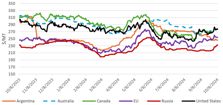 Мировой рынок: После публикации сентябрьского WASDE котировки мировых экспортеров в основном выросли на фоне опасений по поводу посевов озимой пшеницы в Северном полушарии, особенно в связи с засухой в России. Котировки в ЕС подскочили на 14 долларов за тонну на фоне сокращения предложения и снижения оценок производства. Российские котировки также подскочили на $14/т на фоне сокращения поставок, в то время как влажные условия препятствовали сбору урожая яровой пшеницы, а сухие условия сдерживали посевы озимой пшеницы в 2025/26 году. Австралийские котировки выросли на 11 долларов за тонну на фоне ограниченного количества осадков в сентябре. Котировки в Канаде выросли на 9 долларов за тонну, как и у других экспортеров, поскольку сбор урожая яровой пшеницы близится к завершению. Котировки в США выросли на $7/тонна благодаря высоким экспортным продажам. Аргентинские котировки, напротив, снизились на 12 долларов за тонну, поскольку своевременные дожди в некоторых районах выращивания ослабили опасения по поводу предстоящего урожая 2024/25 годов.