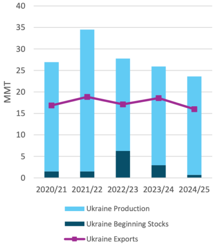 Несмотря на сокращение поставок из Украины, конкурентоспособные экспортные цены, постоянный доступ к глубоководным морским портам на Черном море и снижение конкуренции со стороны Европейского союза способствовали росту экспорта в первом квартале. Хотя Испания остается основным экспортным рынком, Украина заметно расширила экспорт в Индонезию, Египет, Вьетнам, Алжир и другие ключевые рынки Азии и Ближнего Востока. Экспорт Украины в 2024/25 году прогнозируется на уровне 16,0 млн тонн, что на 2,6 млн тонн меньше, чем в прошлом году, поскольку темпы экспорта замедлятся после сбора урожая кукурузы и вернутся к типичным сезонным схемам отгрузки.