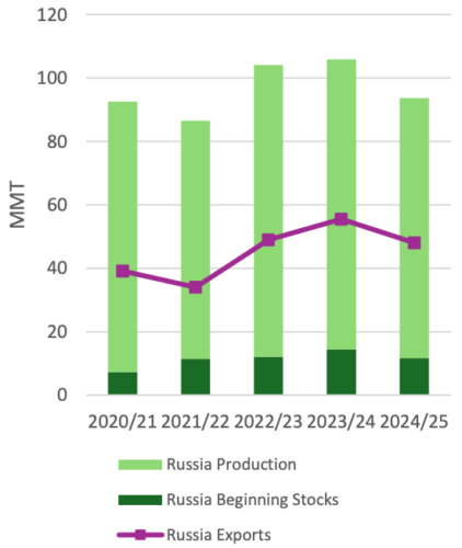 По данным СовЭкон, запасы пшеницы на 1 сентября сократились на 14 процентов по сравнению с прошлым годом. Российский союз экспортеров зерна заявил о намерении обратиться в Министерство сельского хозяйства с просьбой пересмотреть распределение экспортных квот на вторую половину сезона, учитывая опасения, что поставки для внутреннего потребления будут ограничены из-за высоких темпов экспорта. Экспорт пшеницы из России в 2024/25 году прогнозируется на уровне 48,0 млн тонн, что на 7,5 млн тонн меньше, чем в предыдущем году.