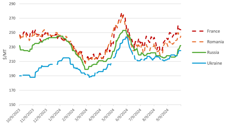 Россия и Украина активно начали экспортный сезон 2024/25, чему способствовали конкурентоспособные цены по сравнению с ценами в ЕС. Производство пшеницы в ЕС, по оценкам, снизилось на 9 % по сравнению с прошлым годом, при этом сильно сократился объем и качество урожая ведущего экспортера — Франции. Это позволило России и Украине увеличить долю рынка на ключевых рынках ЕС в Азии, на Ближнем Востоке и в Африке в первом квартале 2024/25 года (июль-сентябрь), несмотря на меньшие экспортные поставки.