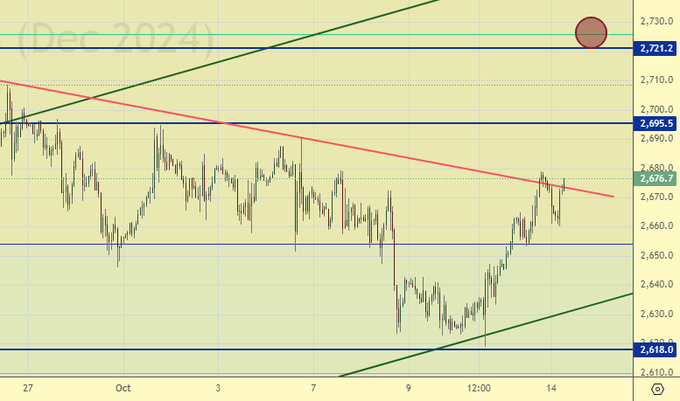 Ничего качественного кроме шорта от 2720 предложить невозможно. О падении с текущих уровней можно рассуждать, и даже эту идею можно отрабатывать, но желательно получить по ней подтверждение в виде красной часовой свечи. Золото вряд ли пойдет вверх без соответствующего фона. Необходим постоянный ужас. Доллар, похоже, в ближайшее время слабостью нас не порадует. А вот после выборов 5-го ноября возможно.