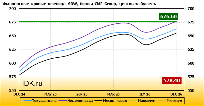 На 14.10.2024 стоимость пшеницы SRW на бирже CME Group по контракту DEC 24 составила 585.2 цента за бушель. За прошедшую неделю стоимость пшеницы SRW упала на 7.2 цента/бушель. Как мы видим на графике, фьючерсная кривая имеет периоды, когда более дальний фьючерс дешевле ближнего. Состояние бэквардации наблюдаем на следующих контрактах: JLY 26. Таким образом, трейдеры предполагают, что возможно превалирование предложения над спросом в указанные периоды.
