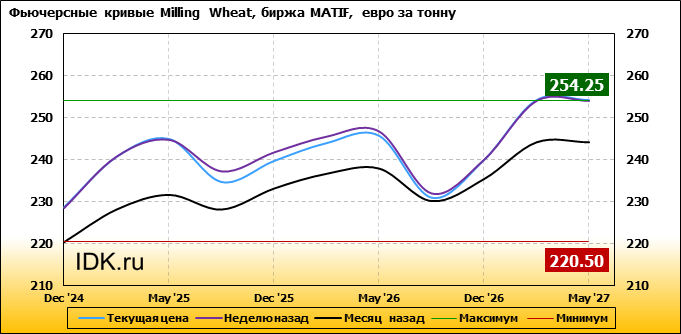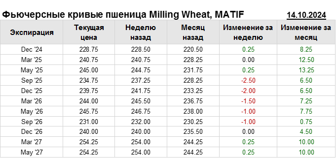 На 14.10.2024 стоимость пшеницы Milling Wheat на бирже MATIF по контракту Dec ’24 составила 228.75 евро за тонну. За прошедшую неделю стоимость пшеницы Milling Wheat выросла на 0.25 евро/тонна. Как мы видим на графике, фьючерсная кривая имеет периоды, когда более дальний фьючерс дешевле ближнего. Состояние бэквардации наблюдаем на следующих контрактах: Sep ’25; Sep ’26. Таким образом, трейдеры предполагают, что возможно превалирование предложения над спросом в указанные периоды.
