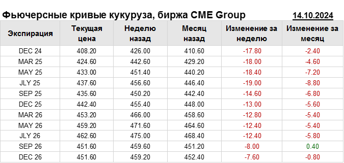 На 14.10.2024 стоимость кукурузы на бирже CME Group по контракту DEC 24 составила 408.2 цента за бушель. За прошедшую неделю стоимость кукурузы на площадке CME Group упала на 17.8 цента/бушель. Как мы видим на графике, фьючерсная кривая имеет периоды, когда более дальний фьючерс дешевле ближнего. Состояние бэквардации наблюдаем на следующих контрактах: SEP 25; SEP 26. Таким образом, трейдеры предполагают, что возможно превалирование предложения над спросом в указанные периоды.