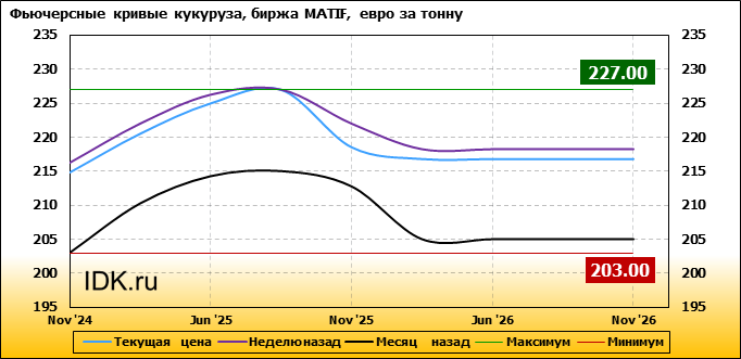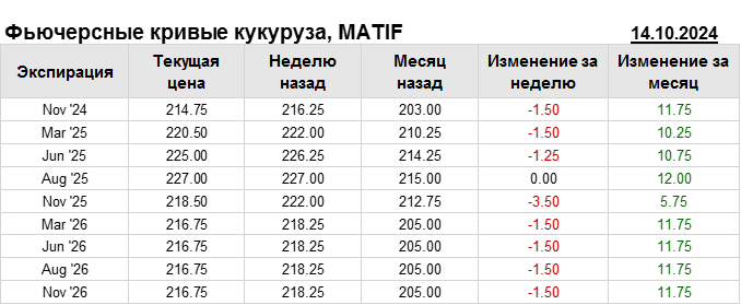 На 14.10.2024 стоимость кукурузы на бирже MATIF по контракту Nov ’24 составила 214.75 евро за тонну. За прошедшую неделю стоимость кукурузы на европейской площадке упала на 1.5 евро/тонна. Как мы видим на графике, фьючерсная кривая имеет периоды, когда более дальний фьючерс дешевле ближнего. Состояние бэквардации наблюдаем на следующих контрактах: Nov ’25; Mar ’26. Таким образом, трейдеры предполагают, что возможно превалирование предложения над спросом в указанные периоды.