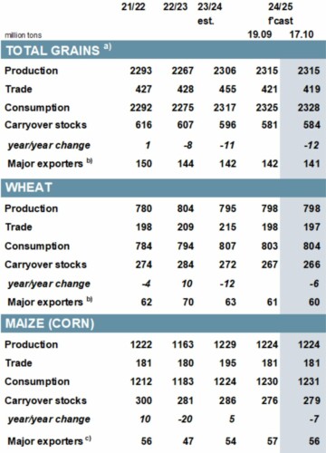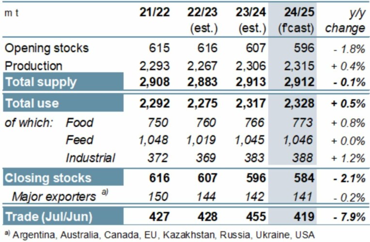 Несмотря на ожидаемое небольшое снижение производства кукурузы, общее мировое производство зерновых, согласно прогнозам, вырастет на 9 млн т до рекордных 2 315 млн в 2024/25 гг. Общий объем предложения зерновых снизится на несколько процентов по сравнению с предыдущим годом из-за сокращения начальных запасов. Мировое потребление также прогнозируется на новом пике, на 11 млн т выше г/г, до 2 328 млн, причем наибольший прирост будет наблюдаться в пищевой и промышленной отраслях.