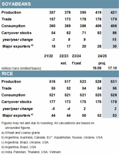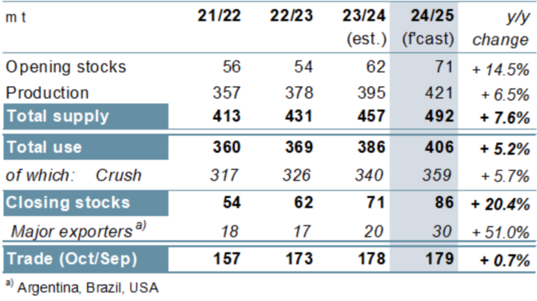 В связи с ожиданиями высоких урожаев у основных производителей, мировой урожай соевых бобов в 2024/25 гг. будет самым большим за всю историю и на 7% выше по сравнению с прошлым годом. Поскольку растущий спрос со стороны кормового, пищевого и промышленного секторов будет поддерживать тенденцию к росту переработки, мировая загрузка увеличится на 5%, а совокупные запасы также достигнут максимума. Ожидается, что объем торговли возрастет до пика в 179 млн т (+1%), включая очередной сезон поставок в Китай, превышающий средние показатели. Что касается экспортеров, то США и Бразилия намерены увеличить объемы поставок.