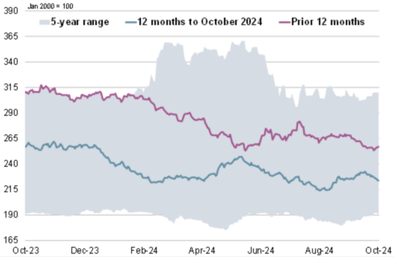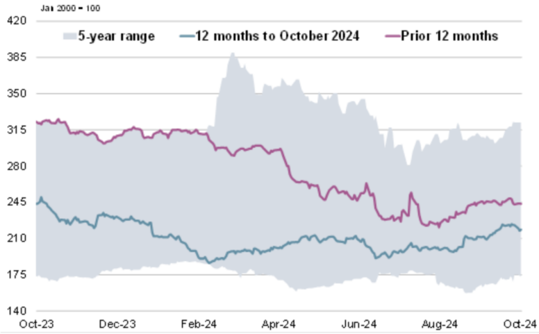 Мировое производство зерновых (пшеницы и фуражного зерна) на 2024/25 гг. прогнозируется на уровне 2 315 млн т. Локальная засуха несколько ухудшила перспективы пшеницы в Австралии и Аргентине в преддверии основного периода уборки озимых. Прогнозы для ЕС и России также снижены, но с учетом компенсирующего повышения в других странах, в том числе в Казахстане (пшеница) и Турции (ячмень), оценка мирового урожая не изменилась м/м (месяц к месяцу).