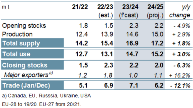 Почти полностью связанный с повышением показателя использования кормов, прогноз общего потребления увеличился на 3 млн т до 2,328 млн т. С учетом более значительных, чем предполагалось ранее, запасов на начало периода, показатель мировых переходящих запасов (совокупность соответствующих местных маркетинговых лет) увеличивается на 3 млн т м/м, до 584 млн. Прогноз по торговле снижен на 2 млн т, до 419 млн, включая меньшие показатели импорта пшеницы (в том числе в Турцию), кукурузы (Китай) и ячменя (Китай, Иран).