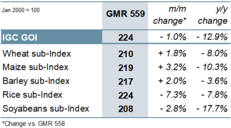 За последний месяц индекс IGC GOI немного ослаб, так как более низкие экспортные котировки риса и сои с лихвой компенсировали рост цен на зерно.