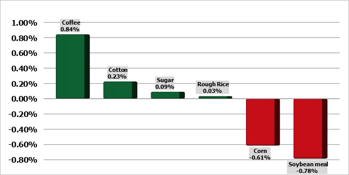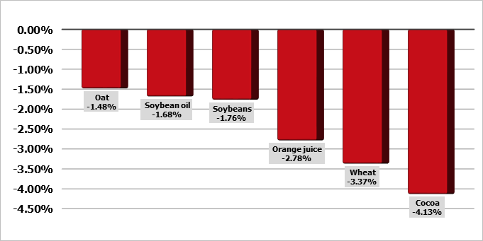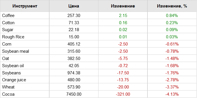 По словам аналитиков, фьючерсы на пшеницу в Чикаго резко упали в пятницу, так как ожидалось, что дожди пойдут на пользу мировым регионам, выращивающим пшеницу. Изменение экспортной политики России также усилило опасения, что американские зерновые компании останутся с большими запасами пшеницы. Фьючерсы на кукурузу и соевые бобы последовали за пшеницей, но были поддержаны высоким спросом, говорят аналитики. Слабые цены на сырую нефть способствовали негативному настрою рынков. Самый активный контракт на пшеницу на Чикагской бирже снизился на 16-3/4 цента до 5,72-3/4 доллара за бушель и упал на 4,4 процента за неделю. Кукуруза на CBOT подешевела на 2 цента до 4,04-3/4 доллара за бушель, упав за неделю на 2,65 процента. Соевые бобы на CBOT потеряли 18-3/4 цента до $9,70 за бушель и упали на 3,5 процента за неделю.