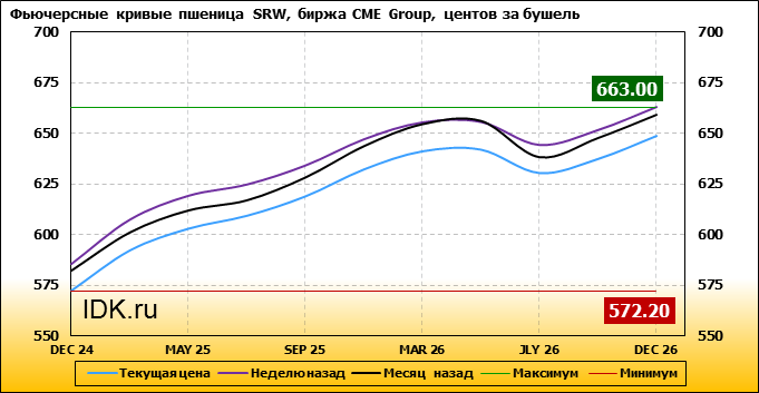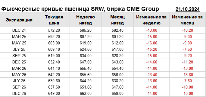 На 21.10.2024 стоимость пшеницы SRW на бирже CME Group по контракту DEC 24 составила 572.2 цента за бушель. За прошедшую неделю стоимость пшеницы SRW упала на 13 центов/бушель. Как мы видим на графике, фьючерсная кривая имеет периоды, когда более дальний фьючерс дешевле ближнего. Состояние бэквардации наблюдаем на следующих контрактах: JLY 26. Таким образом, трейдеры предполагают, что возможно превалирование предложения над спросом в указанные периоды.