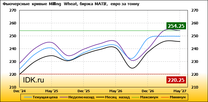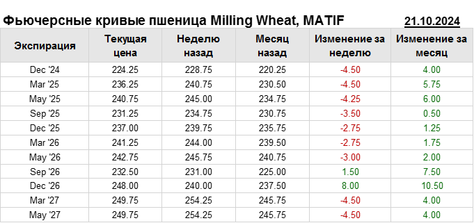 На 21.10.2024 стоимость пшеницы Milling Wheat на бирже MATIF по контракту Dec ’24 составила 224.25 евро за тонну. За прошедшую неделю стоимость пшеницы Milling Wheat упала на 4.5 евро/тонна. Как мы видим на графике, фьючерсная кривая имеет периоды, когда более дальний фьючерс дешевле ближнего. Состояние бэквардации наблюдаем на следующих контрактах: Sep ’25; Sep ’26. Таким образом, трейдеры предполагают, что возможно превалирование предложения над спросом в указанные периоды.
