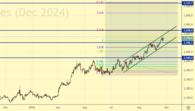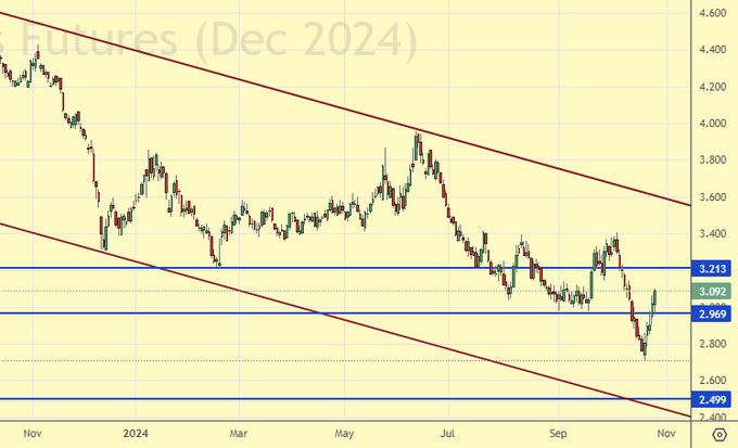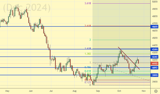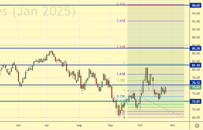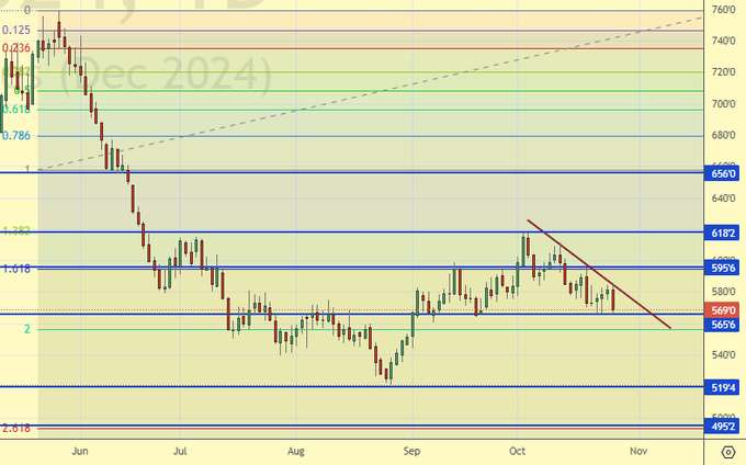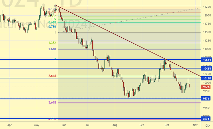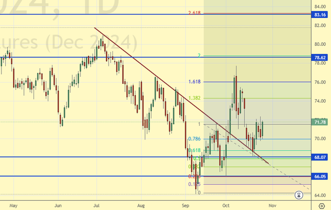 Сценарий роста: перешли на ноябрьский фьючерс, дата экспирации 29 ноября. «…мы купим. И будем ждать, когда Израиль начнет бомбить Иран», — писали мы неделю назад. Большое спасибо товарищам из Тель-Авива. Наш лонг будет жить, не исключено, что очень долго.