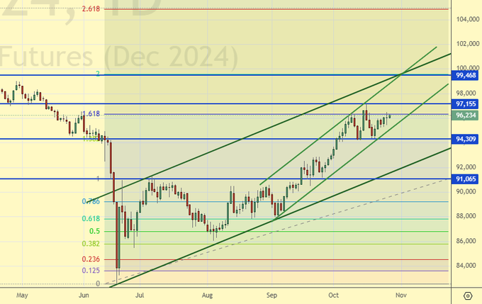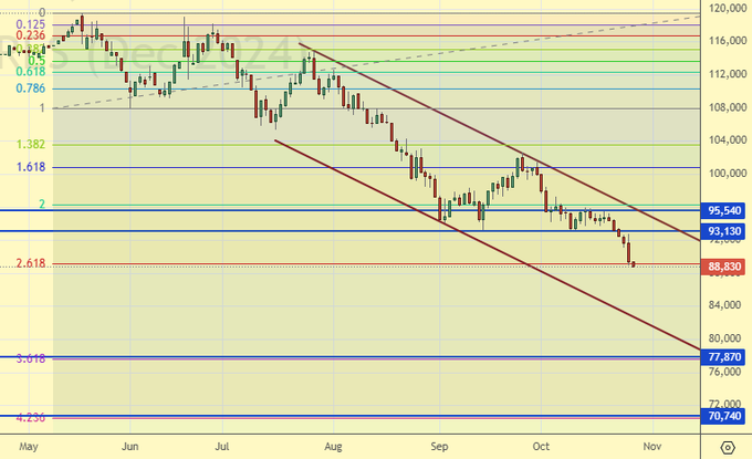 Сценарий роста: рассматриваем декабрьский фьючерс, дата экспирации 19 декабря. При откате к 90000 имеет смысл снова купить. Если он только будет когда-нибудь…
