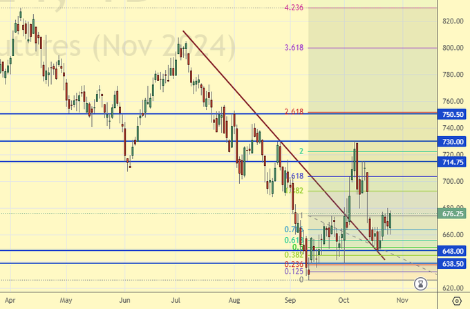 Сценарий роста: рассматриваем ноябрьский фьючерс, дата экспирации 14 ноября. Пока о покупках не думаем. Сои много.