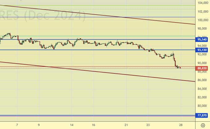 Продажа: при подъеме к 93200. Стоп: 94300. Цель: 77870. Кто в позиции от 94400, перенесите стоп на 89300. Цель: 77870 (пересмотрена).