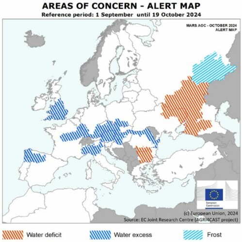 Начиная с марта, анализ проблемных зон проводится не так, как в предыдущих бюллетенях MARS. На карте воздействия на сельскохозяйственные культуры показаны регионы, где летние культуры подверглись негативному воздействию с точки зрения площади и/или урожайности. На этой карте показаны воздействия, произошедшие с начала летнего сезона. Однако сокращение площадей или повторный посев определенных культур без существенного влияния на потенциал урожайности оставшихся посевных площадей этой культуры не повторяется в последующих выпусках бюллетеня, как только сокращение площадей отражается в статистике. На карте предупреждений отмечены необычные погодные явления, произошедшие в анализируемый период, с 1 сентября по 19 октября, и потенциально оказавшие негативное влияние на посевы. Это последний выпуск карты воздействия на урожай летних культур на сезон 2023-2024 годов.
