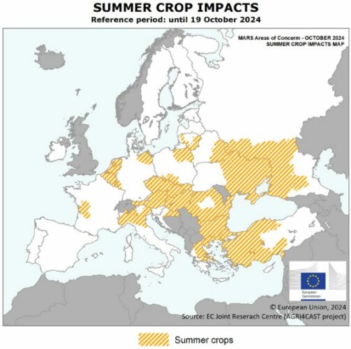 Карта влияния погоды на урожай обобщает негативное влияние погоды на летние культуры с начала сезона. В ходе текущего анализа было добавлено только влияние чрезмерно влажных условий в восточной Италии и южной Польше. Воздействие, отмеченное в Нидерландах, Бельгии и Люксембурге, связано с поздним началом сезона. В Италии воздействие на урожай связано с чрезмерно влажными условиями в начале и конце сезона. В северной Польше, южной Литве, Австрии, Чехии, Словакии, Венгрии, Румынии, Болгарии, Греции, Турции, Украине и России летние культуры пострадали из-за жаркой и сухой погоды в течение лета.