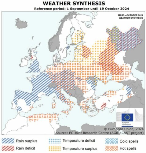 На юге Румынии и в западной Болгарии посевная была затруднена из-за очень сухой почвы; осадки в конце сентября улучшили ситуацию, но для поддержания всходов и начального развития растений необходимо больше осадков. На востоке Украины и юге России сохраняется дефицит осадков; для оптимального сева озимых зерновых необходимо больше осадков. В центральной части России похолодание около 10 октября повлияло на недавно взошедшие озимые культуры.