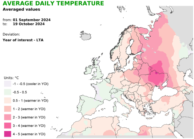 На большей части Восточной Европы наблюдался избыток температуры. Наиболее отчетливые положительные аномалии температуры наблюдались от Польши и Украины до южной Финляндии и центральной части европейской части России. Во многих из этих регионов среднесуточные температуры превышали LTA на 4 °C (до 5 °C в Сумской области на севере Украины), а период обзора стал самым теплым с 1991 года. Исключительно жаркие периоды (20 и более дней со среднесуточной температурой выше 30 °C в сентябре) наблюдались на большей части центральной и восточной Европы, в западной Румынии, на северо-западе Болгарии, на большей части Греции, в некоторых районах Турции, а также на севере Туниса и Алжира. Необычные похолодания наблюдались в центрально-восточных областях европейской части России (Башкортостан, Оренбургская), где среднесуточные температуры с начала октября опускались ниже 0 °C и были значительно ниже LTA, причем отрицательные температуры наблюдались до 15 дней чаще, чем LTA.