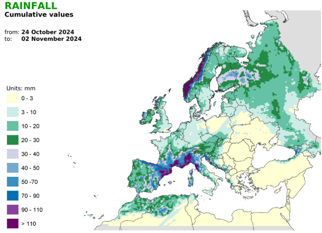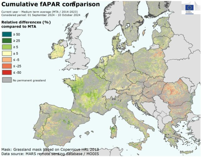 В центральной и западной Европе сильные дожди и локальные наводнения осложнили проведение полевых работ до наступления периода покоя. В восточной Европе обильные осадки ослабили давление жаркой и сухой погоды, но их было недостаточно для полного восстановления пастбищ. На юге страны луга вышли из летней спячки, и влажные условия пошли им на пользу. В Северной Европе после теплого лета температура вернулась к благоприятным значениям, что привело к хорошему состоянию лугов перед зимним покоем.