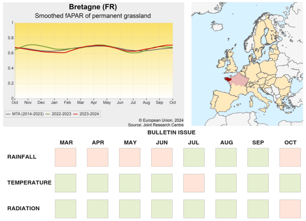 В Ирландии условия были более сухими, чем обычно, на севере, с небольшим радиационным дефицитом на большей части страны. Тем не менее, сигнал fAPAR соответствует MTA по всей стране. Во Франции пастбища показывают хорошие результаты, продуктивность в большинстве регионов выше среднего уровня. Однако ожидается, что нынешние исключительно влажные условия ограничивают доступность полей и снижают качество кормов. Кроме того, уборка зеленой массы кукурузы была осложнена и локально задержана; тем не менее, согласно текущим прогнозам, урожайность останется близкой к среднему уровню за 5 лет. В странах Бенилюкса теплое и солнечное начало сентября сменилось температурой, соответствующей средним значениям, и радиацией немного ниже среднего, что в целом привело к хорошим условиям для роста. Уборка зеленой массы кукурузы продолжается, урожайность ожидается ниже средней.